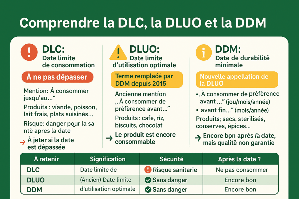 La DLUO (Date Limite d’Utilisation Optimale) n’est pas une date de péremption ! Ce marquage indique simplement que le produit peut perdre un peu de goût ou de texture après cette date, mais reste consommable sans danger.